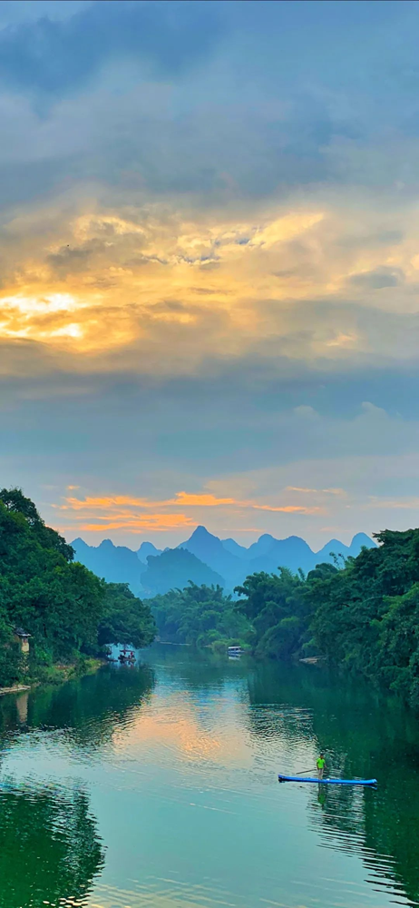 晨曦初照,山巒披金,河面泛銀