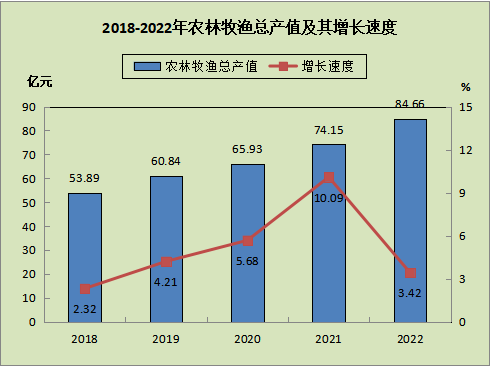 2022年,全縣農(nóng)林牧漁業(yè)總產(chǎn)值84.66億元,增長3.4%。其中:農(nóng)業(yè)產(chǎn)值44.31億元,增長4.54%;林業(yè)產(chǎn)值9.80億元,下降4.0%;牧業(yè)產(chǎn)值25.83億元,增長4.6%;漁業(yè)產(chǎn)值1.10億元,下降3.8%。糧食產(chǎn)量增長0.3%;糖料蔗產(chǎn)量增長2.4%;蔬菜產(chǎn)量增長4.2%;水果產(chǎn)量增長14.9%;肉類總產(chǎn)量增長1.9%,其中豬肉產(chǎn)量增長5.2%,禽肉產(chǎn)量下降5.3%;鮮蠶產(chǎn)量增長8.0%,禽蛋產(chǎn)量增長10.4%;水產(chǎn)品產(chǎn)量增長2.8%;生豬出欄數(shù)增長3.7%;家禽出欄數(shù)下降2.6%。