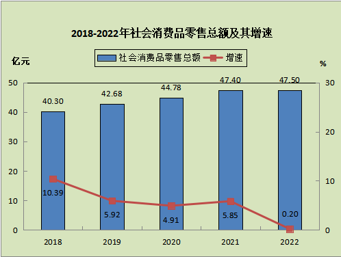 2022年,全縣社會消費(fèi)品零售總額47.49億元,增長0.2%。分行業(yè)來看,批發(fā)業(yè)銷售額8.57億元,下降24.8%;零售業(yè)銷售額37.38億元,增長1.0%;住宿業(yè)營業(yè)額0.69億元,下降10.0%;餐飲業(yè)營業(yè)額11.81億元,增長3.8%。